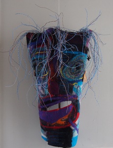 2020Masker gemaakt in Corona tijd, vervilte wol en zijde geplaatst op een stalen frame met versleten borstel van een veegmachine